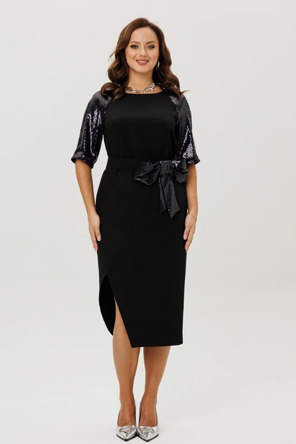 Нарядное женское платье, выполненное из двух видов ткани: плательно-костюмной (тянется ) и плательной с пайетками (тянется).
