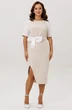 Платье полуприлегающего силуэта, покроя «Реглан». По переду ассиметричный подрез, переходящий в рельеф. Рельеф переходит в талиевую вытачку. По спинке средний шов, потайная застежка-молния и талиевые вытачки. Низ переда и спинки фигурной формы с разрезом по переду. Горловина округлой формы. Рукава-реглан со швом по середине и на подкладке. Само платье без подкладки. В комплект входит съемный пояс, выполненный из основной ткани, декорированный пышным бантом из пайеток.