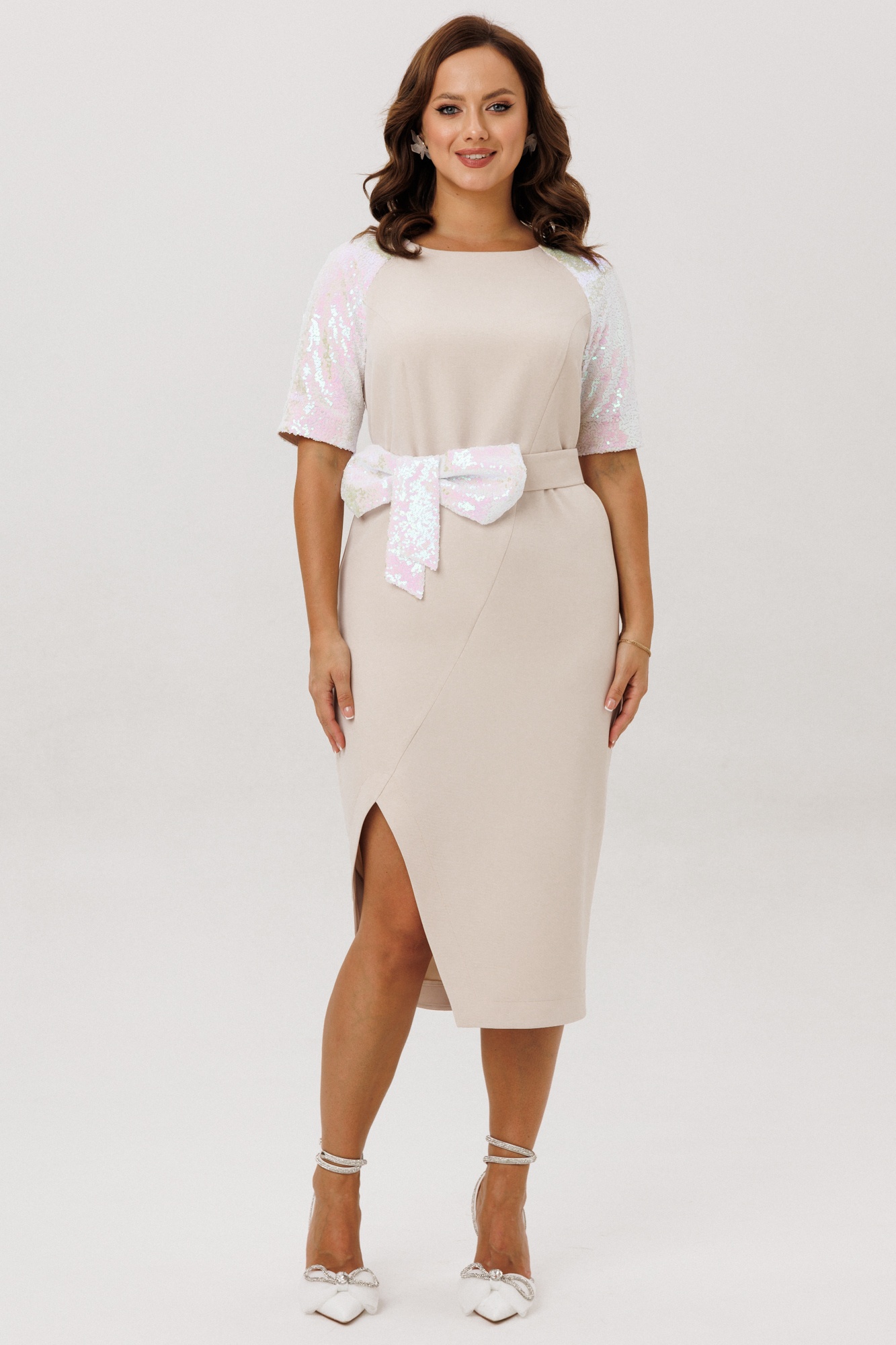 Платье полуприлегающего силуэта, покроя «Реглан». По переду ассиметричный подрез, переходящий в рельеф. Рельеф переходит в талиевую вытачку. По спинке средний шов, потайная застежка-молния и талиевые вытачки. Низ переда и спинки фигурной формы с разрезом по переду. Горловина округлой формы. Рукава-реглан со швом по середине и на подкладке. Само платье без подкладки. В комплект входит съемный пояс, выполненный из основной ткани, декорированный пышным бантом из пайеток.