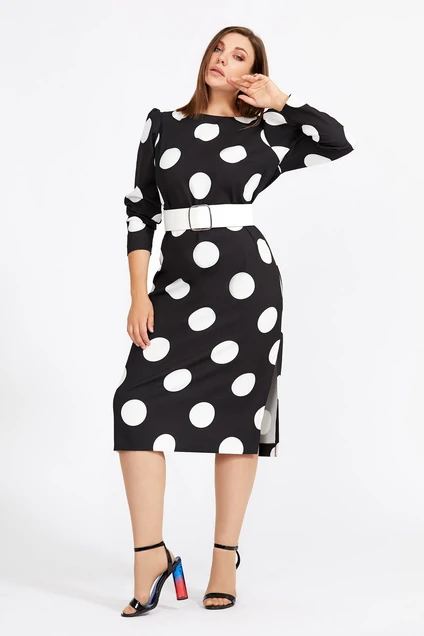Платье женское полуприлегающего силуэта без подкладки, выполнено из плательной ткани (чуть тянется). Вырез горловины «лодочкой», рукав втачной, по окату рукава сборка. По спинке потайная тесьма – молния. В левом боковом шве обработан разрез. Декором служит ремень. Длина платья – 113 см. Длина рукава – 63 см. Ширина рукава в пройме – 42 см.