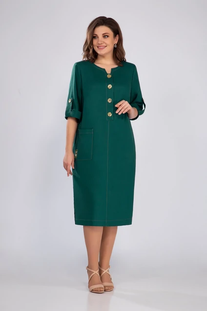 Платье женское прямого силуэта, выполнено из льняного полотна (не тянется). Вырез горловины круглый, рукав втачной, по низу на манжете с патой, застежка – планка по центру на петлях и пуговицах. По полочке накладной карман. Длина платья – 108 см. Длина рукава – 38 см. Ширина рукава в пройме – 42 см.