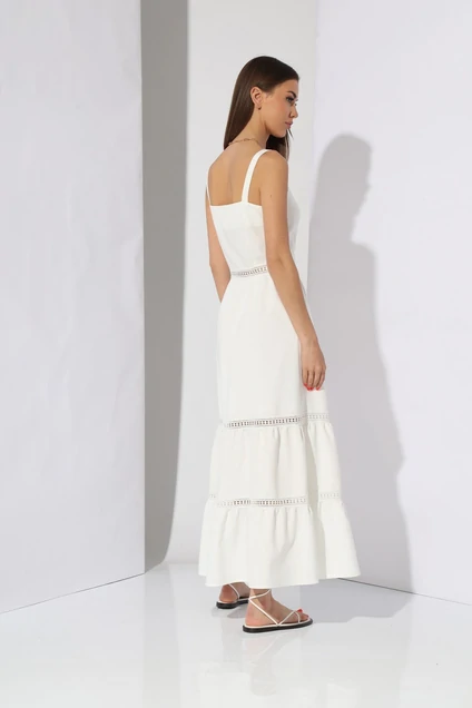 Платье на бретелях. Полуприлегающего силуэта до талии, расширяющееся к низу. Нижняя часть с притачными воланами со сборкой. Застежка – планка на петли и пуговицы. Верхняя часть переда и спинки с вертикальными рельефами. По верхнему, между воланами платье декорировано хлопковым кружевом.