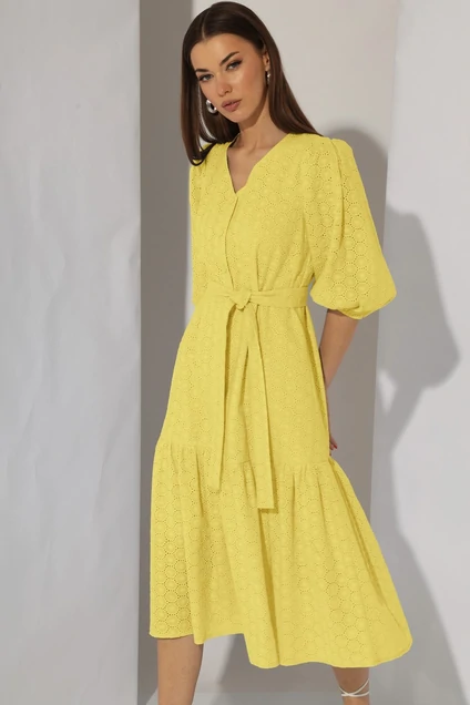 Платье женское "А" - образного силуэта, втачного покроя с центрально-бортовой застежкой на петли-пуговицы имитирующей планку. Платье выполнено из хлопковой плательной ткани, с вышивкой "ришелье", на хлопковой подкладке. Платье с "V" образным вырезом, по низу притачен волан со сборкой. Рукава со сборкой и встречной складкой по окату и резинкой по низу, что делает рукав пышным и объемным более романтичным. В данной модели плечо заужено, длина рукава до локтя. По переду расположены нагрудные вытачки идущие из бокового шва. К платью прилагается пояс из основной ткани.