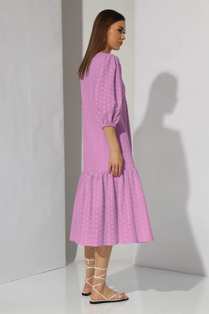 Платье женское "А" - образного силуэта, втачного покроя с центрально-бортовой застежкой на петли-пуговицы имитирующей планку. Платье выполнено из хлопковой плательной ткани, с вышивкой "ришелье", на хлопковой подкладке. Платье с "V" образным вырезом, по низу притачен волан со сборкой. Рукава со сборкой и встречной складкой по окату и резинкой по низу, что делает рукав пышным и объемным более романтичным. В данной модели плечо заужено, длина рукава до локтя. По переду расположены нагрудные вытачки идущие из бокового шва. К платью прилагается пояс из основной ткани.