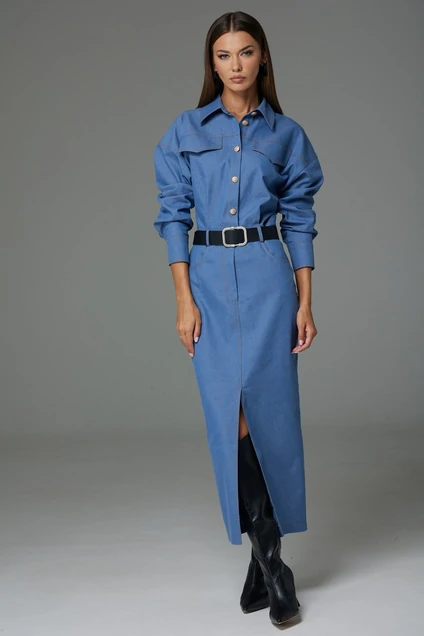 Платье женское выполнено из джинсовой ткани, полуприлегающего силуэта, покроя спущенное плечо, длинной за колено, зауженное к низу. Рукав длинный двушовный с манжетой по низу. Данное платье создает эффект блузы заправленной в юбку по талии. По переду и на спинке расположена горизонтальная кокетка, по спинке средний шов. По переду в шов притачивания кокетки вставлены клапаны. Горловина оформлена воротником стояче-отложным с отрезной стойкой. В верхней части переда расположена центрально-бортовая застежка-планка на петли-пуговицы. В области талии по спинке и по переду расположены пояс-кокетка со шлевками. Нижняя часть платья оформлена как юбка с разрезом по переду с закругленными джинсовыми карманами в бедрах и застежкой на гульфик.