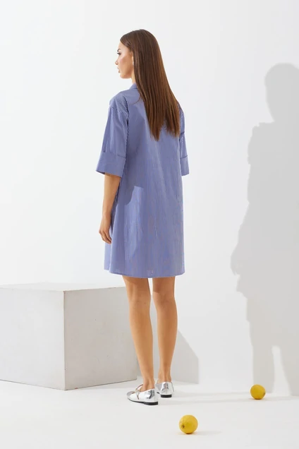 В платье центрально-бортовая застежка на цельнокроеную планку, петли-пуговицы. Рукав до локтя с широкой манжетой. В боковых швах расположены карманы. На правой части переда над грудью расположен декоративный элемент из основной ткани, идущей параллельно планки до низа. Спинка цельная. К платью прилагается пояс из основной ткани.