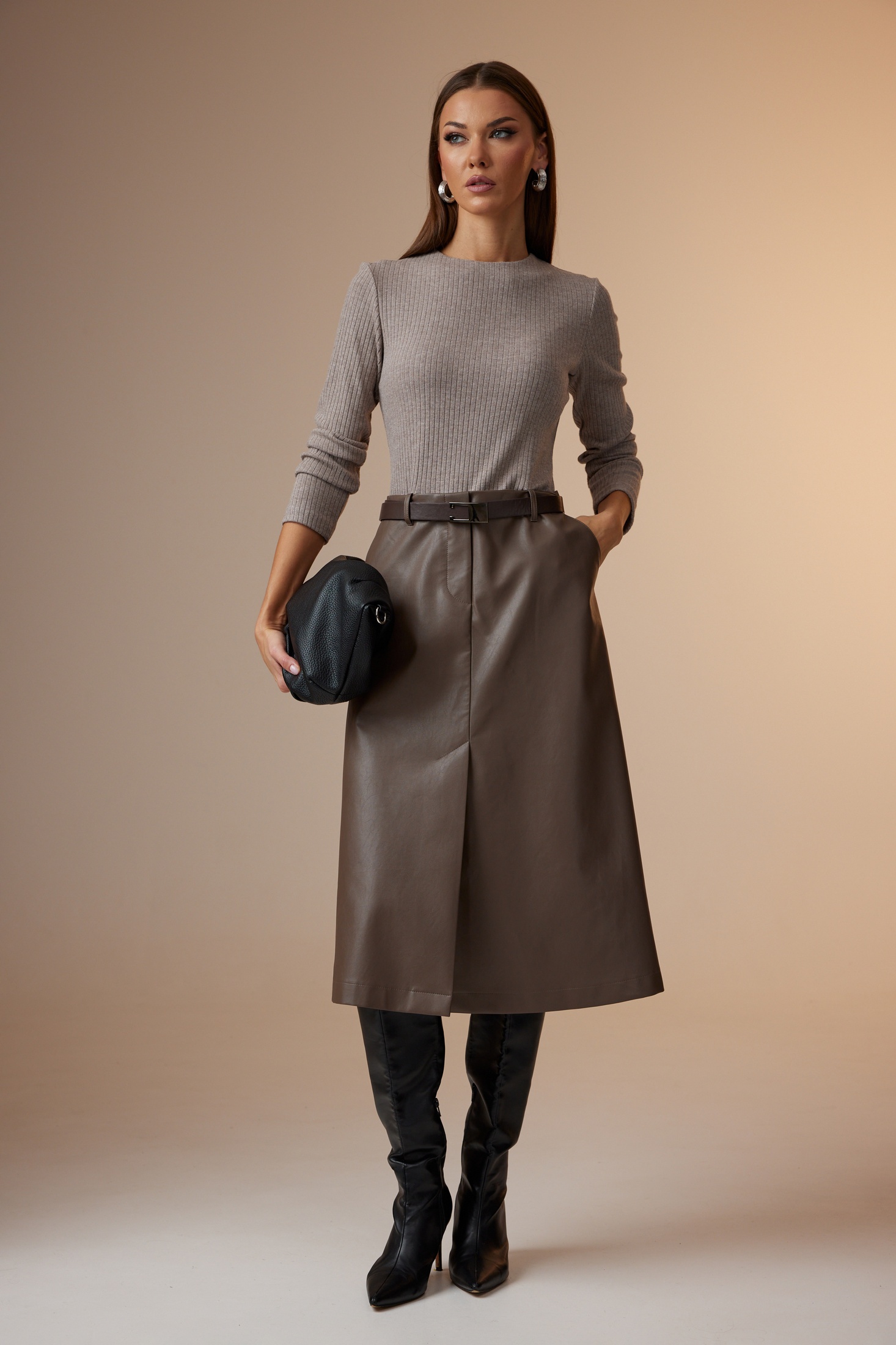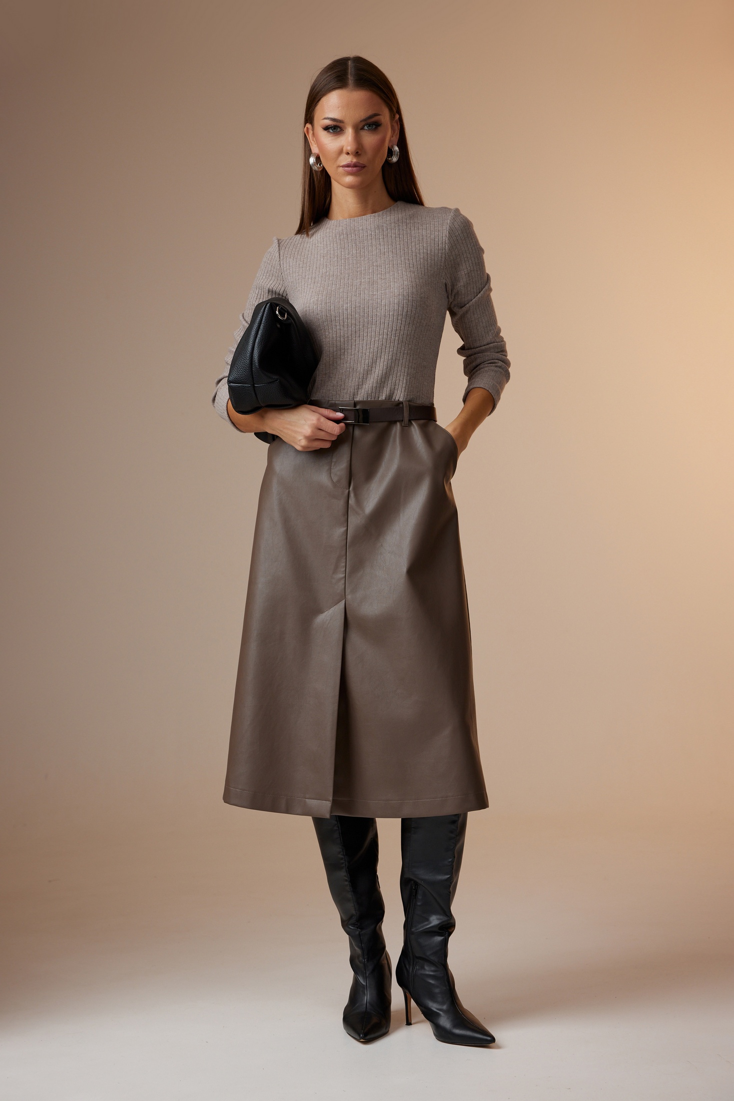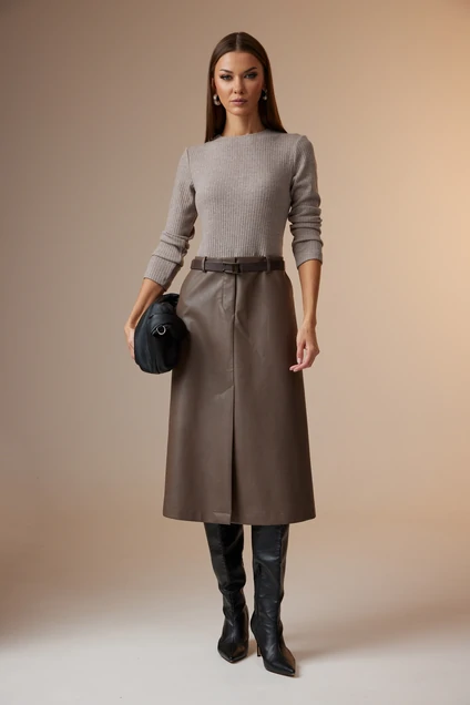 Платье 1654 N.O.W. из коллекции бренда N.O.W. сочетает в себе элегантность и комфорт. Верх из трикотажного полотна с вискозой обеспечивает мягкость и уют, а круглая горловина и длинные втачные рукава делают его подходящим для прохладных дней. Юбка, выполненная из кожзаменителя, добавляет образу стильной строгости. Фасон полуприлегающий, что подчеркивает фигуру, а молния по центру спинки и шлица на юбке добавляют практичности. Платье дополнено наклонными карманами и шлевками для пояса. Идеально для осеннего сезона и деловых встреч. Пудровый цвет усиливает универсальность, позволяя легко комбинировать с другими элементами гардероба. Длина по среднему шву спинки составляет 113 см.