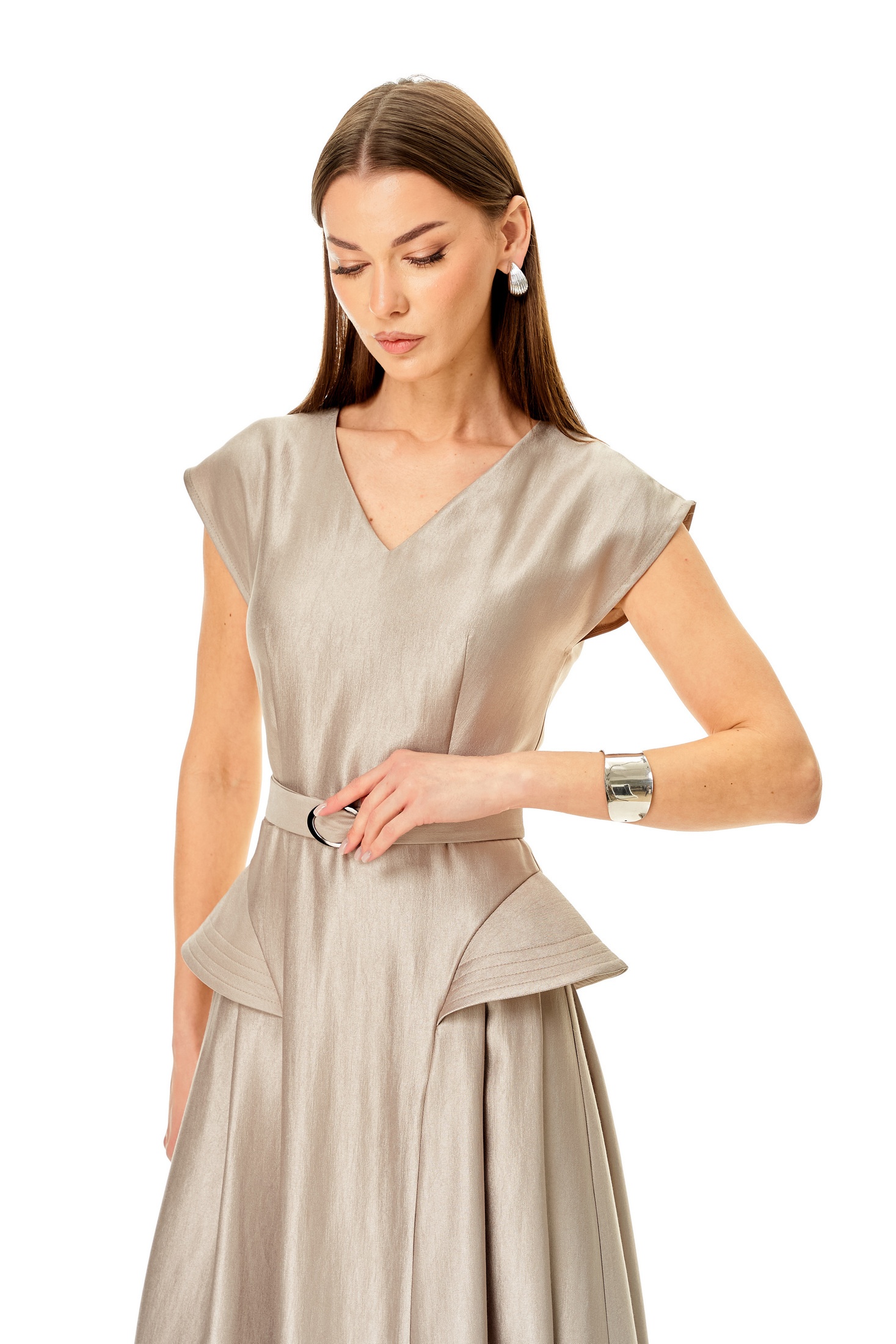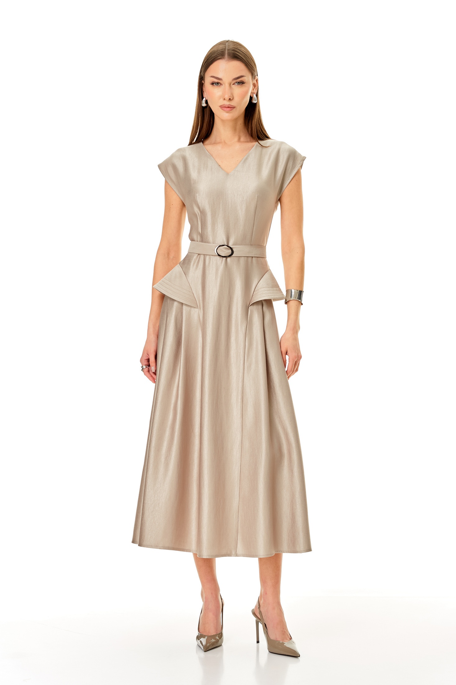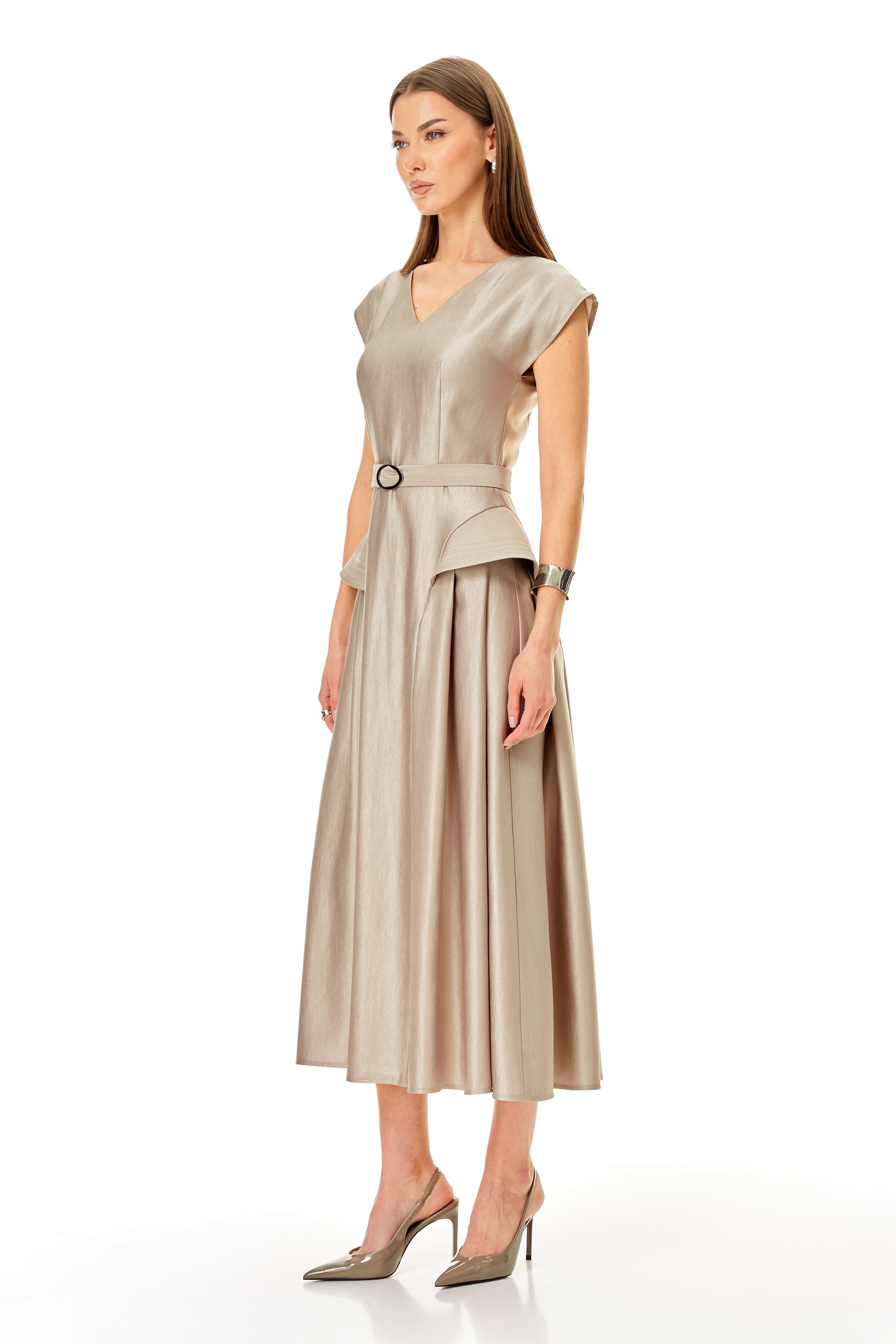 Платье 1682 N.O.W. — это стильное решение, подчеркивающее вашу индивидуальность. Коллекция бренда N.O.W. предлагает приталенное платье, выполненное из качественной ткани с высоким содержанием вискозы, что делает его приятным на ощупь и долговечным. У-образный вырез и спущенные плечи придают изделию особую женственность, а скрытая молния на спинке обеспечивает удобство при надевании. Платье миди длины с поясом и расширенными крыльями на подрезах идеально подходит для весенне-летнего сезона и торжественных мероприятий. Его бежевый цвет легко комбинируется с аксессуарами, создавая гармоничный образ. Длина по среднему шву спинки составляет 126 см, а ширина поясного ремня 3 см.