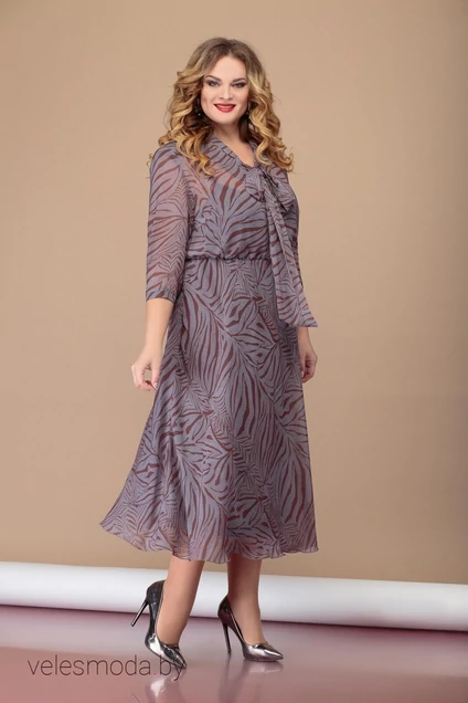 Платье полуприлегающего силуэта, отрезное по линии талии. Лиф переда с нагрудными вытачками.Талия подчеркнута напуском на резинке. Горловина у- образной формы с притачным воротником- бантом. Платье на подкладке. Длина рукава: 45 см.