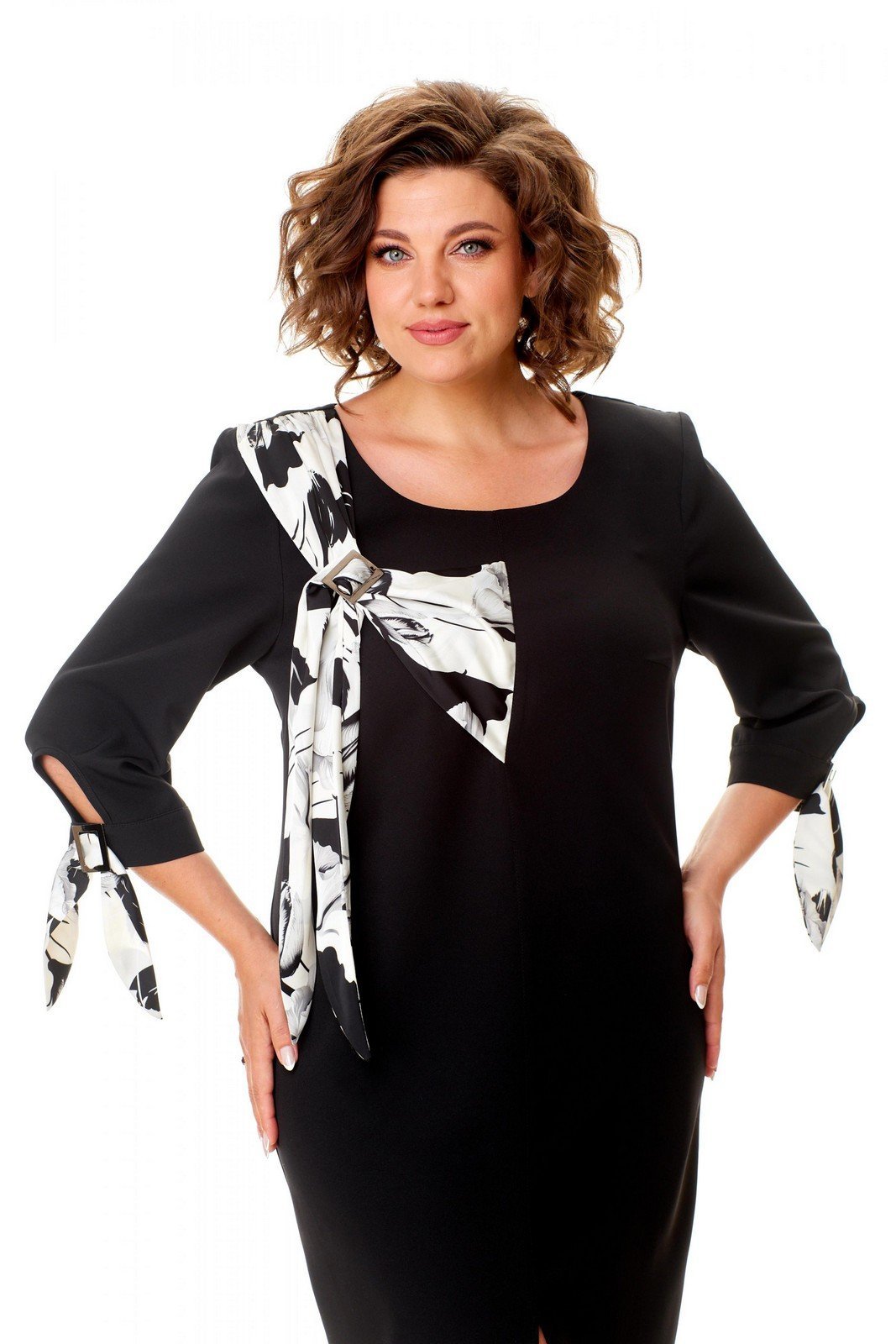 Платье прямого силуэта со средним швом по переду и разрезом. Рукав втачной одношевный по низу на завязке. По лифу бант из отделочной ткани. Длина рукава: 46 см. Длина изделия: 110 см.