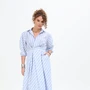 Платье полуприлегающего силуэта, отрезное по талии с объемной юбкой. Перед с глубоким запахом по талии, с защипами под грудью, с настрочной планкой. Спинка с плечевой кокеткой, складкой по центру и кулисой на талии с эластичной тесьмой. Юбка на спинке со сборкой по талии, на переде с глубокими складками. Рукав рубашечного кроя, с встречной складкой по окату и притачной манжетой с петлей/пуговицей. Воротник сорочечный с отрезной стойкой. Застежка на 2 петли/пуговицы на притачном поясе переда. Длина юбки от талии 78/81/84/87 см. Изделие без подкладки.