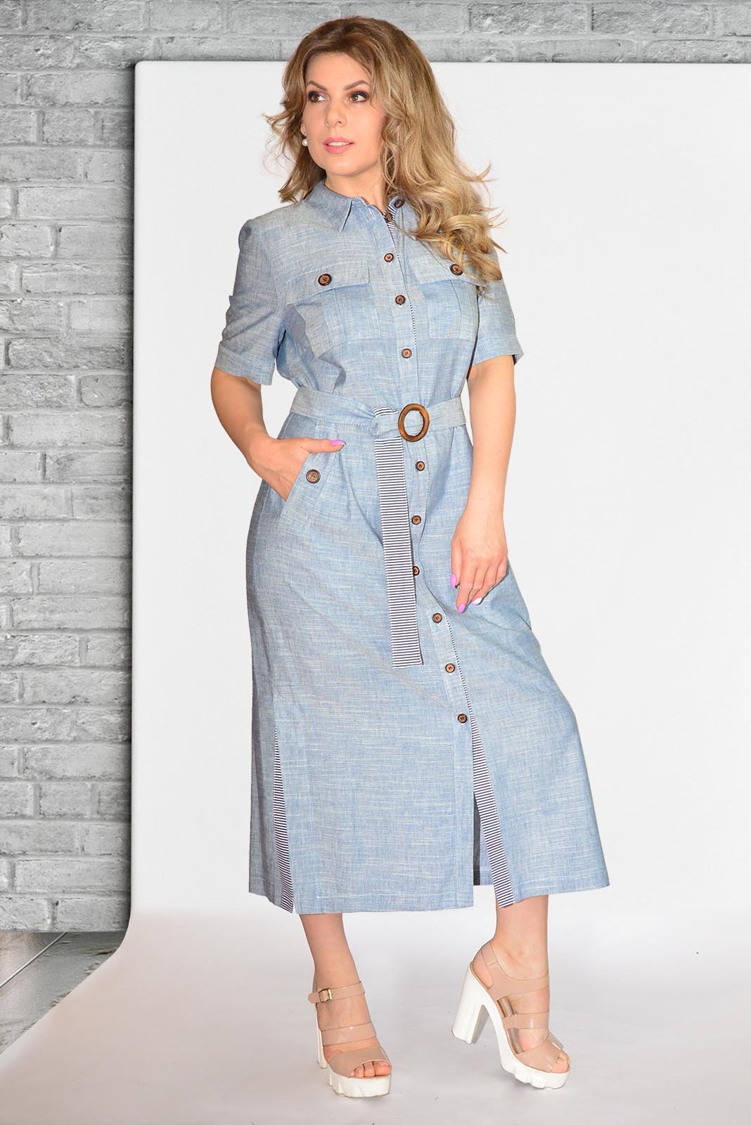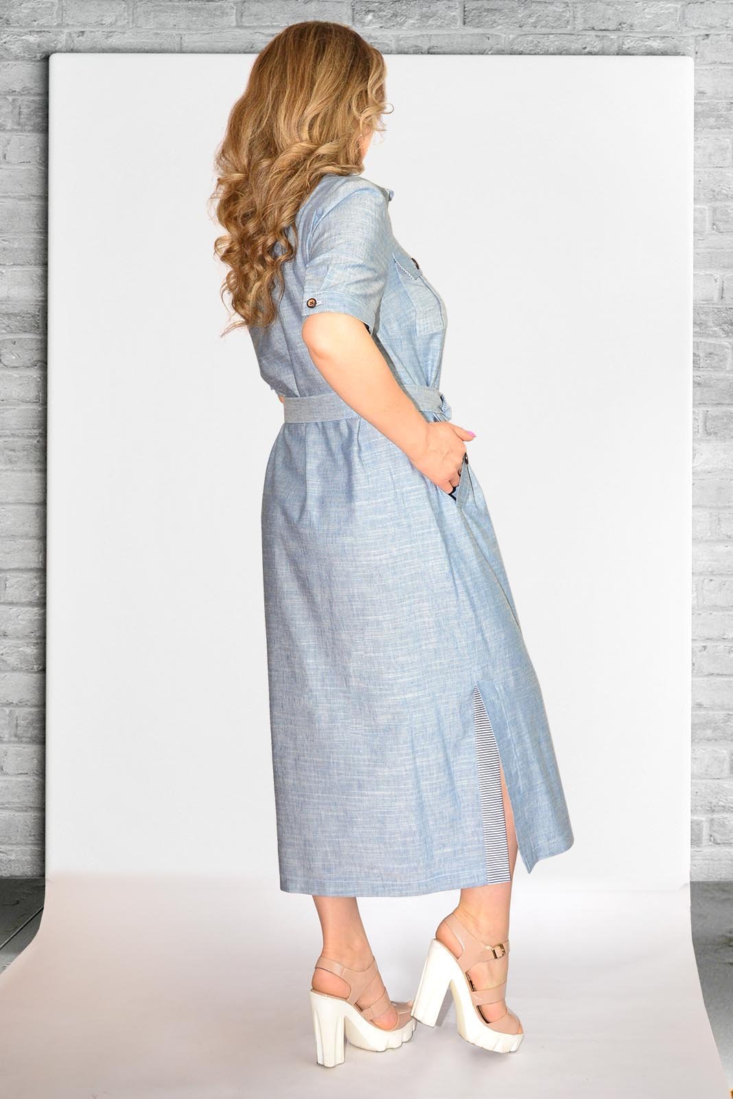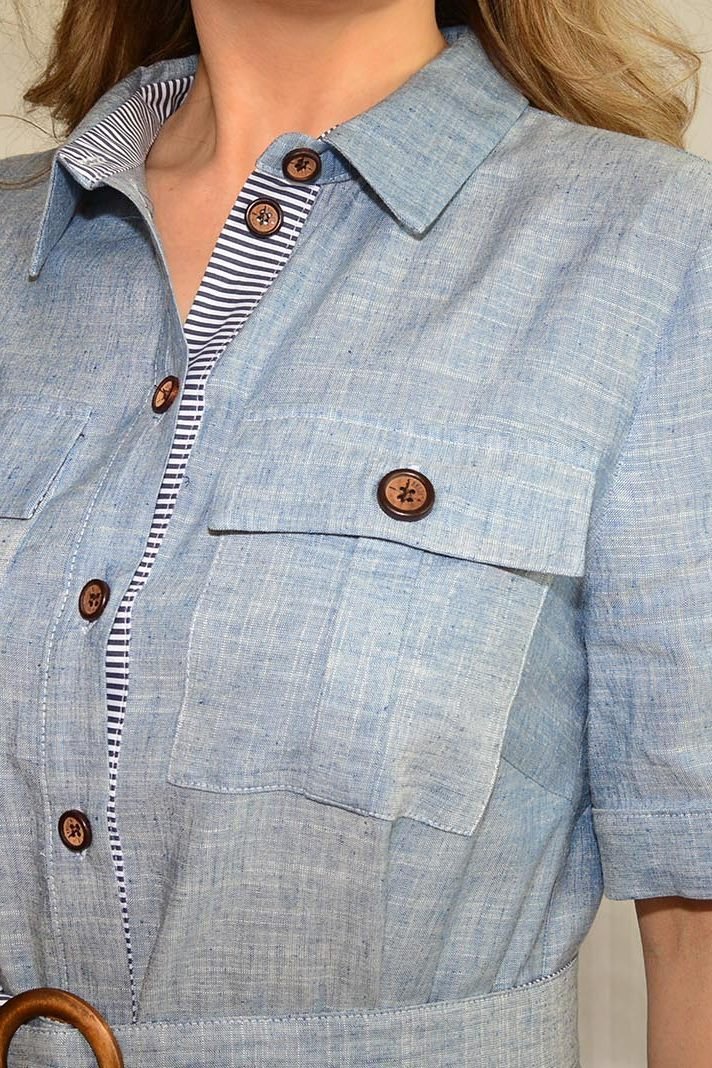 Платье женское из смешанной однотонной меланжевой ткани и отделкой в полоску. Платье повседневное, длиной до середины икры, силуэт платья регулируется съемным поясом, с втачным покроем рукава, с центральной застежкой на петли-пуговицы. Перед с нагрудной вытачкой, идущей от бокового шва, с накладными нагрудными карманами с клапаном с застежкой на 1 петлю и 1 пуговицу, на кармане обработана бантовая складка, ниже линии талии с прорезными карманами с листочкой с настрочными концами, на листочке нашита декоративная пуговица, платье с отрезной планкой под застежку, на которой обработаны 11 петель и 11 пуговиц. Спинка цельная. Низ изделия прямой, в боковом шве со шлицами, нижняя шлица с настрочной отделочной деталью. Рукава втачные одношовные, длиной выше локтя, с притачной манжетой по низу, концы которой застёгиваются на одну обмётанную петлю и пуговицу, по шву притачивания манжеты расположена односторонняя складка. По горловине обработан отложной воротник с отрезной стойкой. Пояс платья двойной, на одном из концов пояса обработана пряжка. В модели детали нижней стойки, левой планки, нижнего клапана, подкладки кармана, окантовка разреза рукава, деталь шлицы, нижний пояс выполнены из отделочной ткани в полоску.