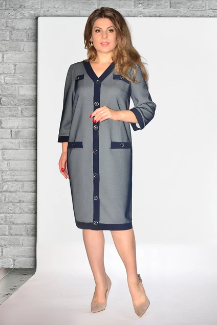 Платье женское элегантное повседневное, для офиса, всё зависит от того, чем будет дополнена данная модель. Платье из двух видов материалов: основной - трикотажное жаккардовое полотно с мелким геометрическим рисунком; отделка - однотонная смешанная ткань. Платье полуприлегающего силуэта, с очень красиво оформленной линией декольте, с втачным покроем рукава, с отрезной планкой по низу, в среднем шве спинки с застежкой на молнию. Перед с нагрудной вытачкой, идущей от бокового шва, со средним швом, в который вставлена планка, отлетной край которой фиксируется на 7 декоративных пуговиц, с настрочными листочками на груди и выше линии бедер, на которых нашиты по 1 пуговице. Спинка с талиевыми вытачками и средним швом, внизу который заканчивается шлицей. Рукава втачные одношовные, длиной 3/4, с отрезной манжетой по низу. По V-образному вырезу горловины обработана бейка, правая часть бейки цельнокроеная с планкой. Изделие с плечевыми накладками.