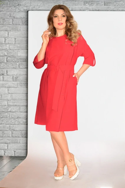 Платье женское элегантное повседневное и нарядное одновременно, в стиле классический look, из однотонной смешанной ткани с фактурой жатки. Платье асимметричное расширенного силуэта, с рукавом рубашечного типа, с карманами в боковых швах. Перед с имитацией смещенной застёжки, отлетные части фиксируются по краю борта на 8 пуговиц. Пуговицы в цвет основного материала - это небольшое дополнение, которое расставляет все точки над "i". Спинка с отрезной кокеткой. Рукава одношовные, длиной чуть ниже локтя, с притачной манжетой и патой по низу, пата фиксируется на 1 пуговицу. Овальный вырез горловины обработан окантовкой. Стилизацию дополняет широкий пояс с пряжкой, который сохраняет пропорции фигуры и позволяет регулировать прилегание. Платье несомненно притягивает на себя внимание!