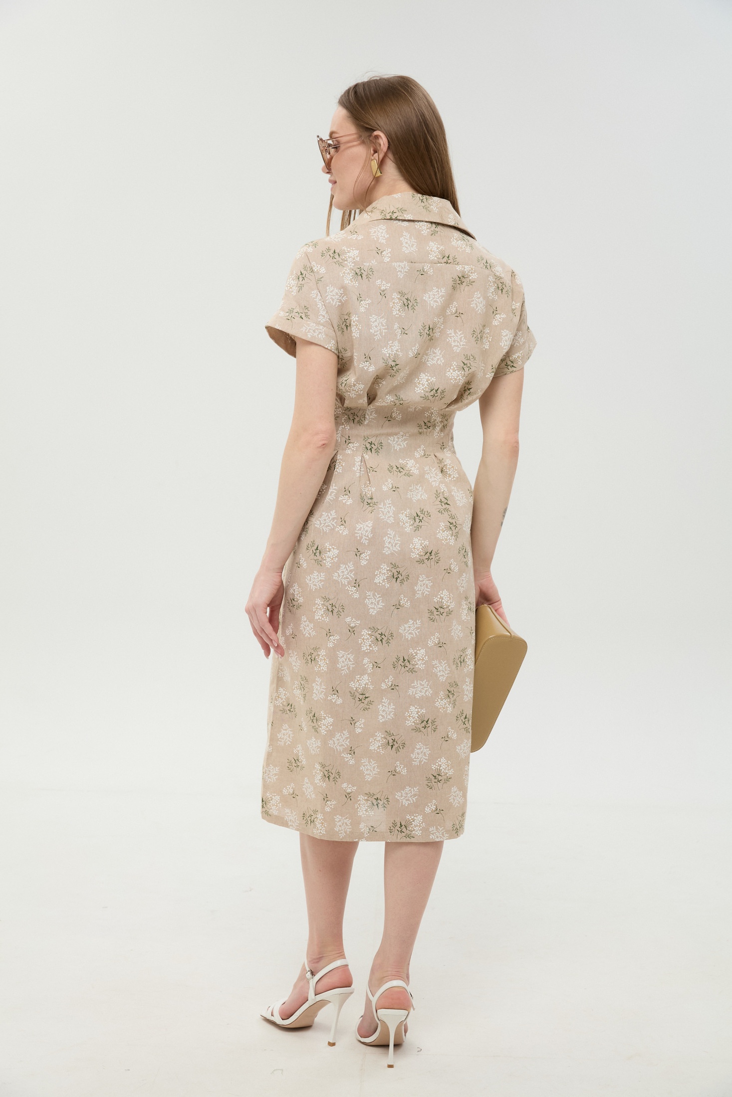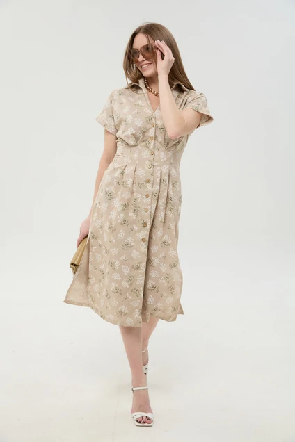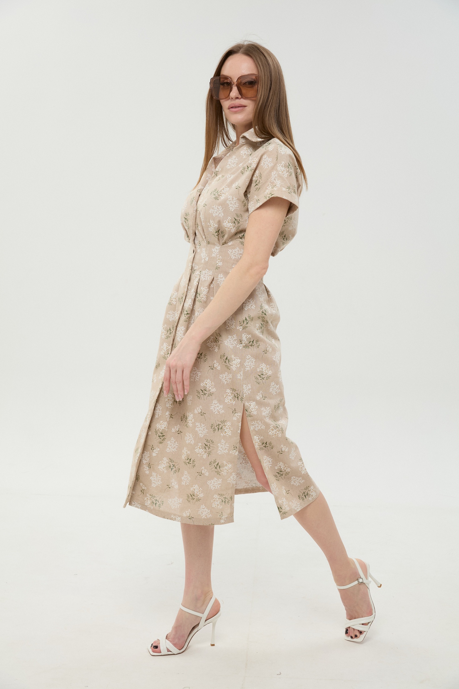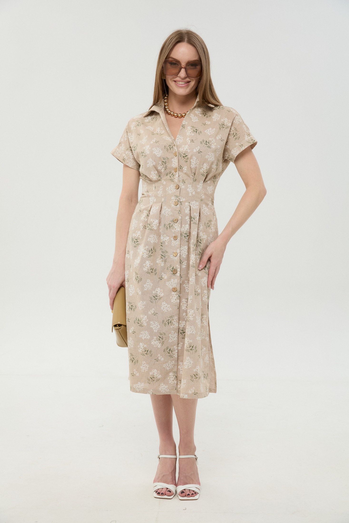Платье 1047-2 песок от NikVa — это изысканный выбор для летнего сезона. Коллекция бренда демонстрирует стиль и практичность благодаря использованию ткани из 28% льна, 49% вискозы и 23% хлопка, что делает изделие лёгким и дышащим. Платье миди длины, прилегающего силуэта, с частично застроченными складками для идеального прилегания. Элегантный V-образный вырез с отложным воротником на стойке придаёт образу дополнительную утонченность. Центральная застежка на петли и пуговицы, а также короткий цельнокроеный рукав с манжетой делают это платье идеальным для повседневного ношения и отдыха. Песочный цвет с цветочным узором подчеркивает женственность и стиль. Боковые разрезы добавляют изделию динамичности и свободы движений.