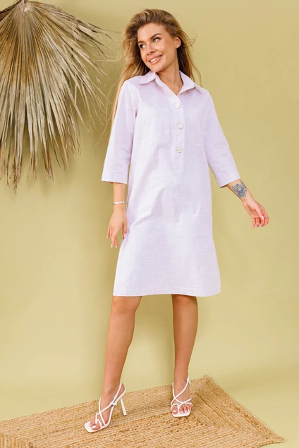 Комфортное хлопковое платье длиной миди свободного прямого кроя со стояче-отложным рубашечным воротником. Рукава втачные длиной три четверти. По боковым швам - разрезы. Изделие без подкладки, с карманами.