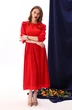 Платье длиной миди, отрезное по линии талии.По переду нагрудные вытачки переведены в талиевые. Лиф спинки со средним швом, талиевыми и плечевыми вытачками, выполнен из костюмной ткани. Юбка со складками на линии талии, расширена к низу. В среднем шве спинки застежка на потайную молнию. Горловина обработана обтачкой. Рукава широкие, втачные,одношовные. По окату рукава заложены мягкие складки. Рукава и юбка платья выполнены из шифона. В комплект к платью идёт съёмная авторская брошь.