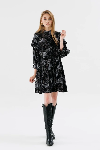 Романтичное платье А-силуэта. Кокетка платья спереди и по спинке изделия дополнена рюшей по краю. Свободную форму платью и рукавам придают сборки, идущие от кокетки. Кокетка переда и воротник-стойка с застёжкой на петли и пуговицы. Рукава по низу собраны на манжеты. По низу платья волан со сборкой. Изделие без подкладки.