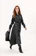Элегантное женское платье-рубашка до пола, изготовлено из качественных тканей, что придает ему исключительный вид. Основной цвет платья — классический черный, который дополнен уникальным геометрическим принтом в бело-красном цвете на боковых вставках и рукавах. Отложной воротник на стойке подчеркивает строгий силуэт. Платье оснащено удобной центральной застежкой на пуговицы по всей длине. Дизайн платья украшен функциональными клапанами на груди, а объемные рукава с манжетами добавляют изысканности. Линия плеч слегка приспущена, что создает расслабленный и одновременно элегантный образ. Пояс из основной ткани подчеркивает талию и дополнительно акцентирует внимание на фигуре. Это платье идеально подходит для тех, кто ценит универсальность и стиль в одежде. Оно будет отлично смотреться как в деловых, так и в более неформальных ситуациях, подчеркивая ваш уникальный вкус.