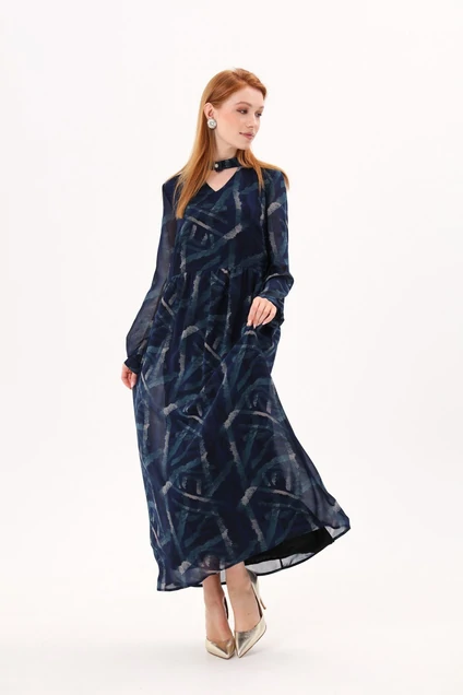 Платье макси прямого силуэта с V-образным вырезом, отрезное по линии талии. Горловине с имитацией чокера, застёжка на петлю и декоративную пуговицу. Рукав немного приспущен, по низу собран на манжет с петлей и пуговицей. Изделие на подкладке. Фурнитура может отличаться от заявленной на фото.