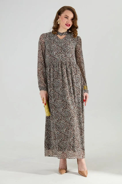 Платье макси прямого силуэта с V-образным вырезом, отрезное по линии талии. Горловине с имитацией чокера, застёжка на петлю и декоративную пуговицу. Рукав немного приспущен, по низу собран на манжет с петлей и пуговицей. Изделие на подкладке. Фурнитура может отличаться от заявленной на фото.