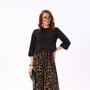 Платье прямого силуэта, состоящее из комбинации двух тканей - основной и отделочной. Воротник цельнокроеный хомут. Рукав одношовный, втачной, длинный. Нижняя юбка из отделочной ткани, со сборкой по линии талии. В виде отделки по левой части переда декоративный элемент из отделочной ткани. Юбка на подкладке.