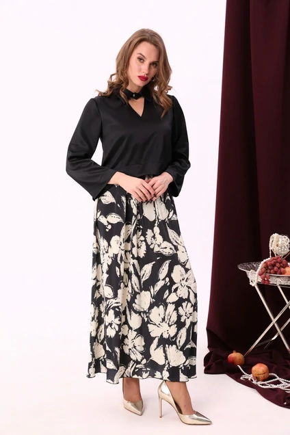 Платье комбинированное, состоящее из двух тканей. Лиф свободного прямого кроя прямого силуэта с V-образным вырезом. Воротник стояче-отложной рубашечного типа, застёгивается на декоративную пуговицу и петлю. Нижняя часть платья прямого силуэта, длинная , со сборкой по линии талии из отделочной ткани.
