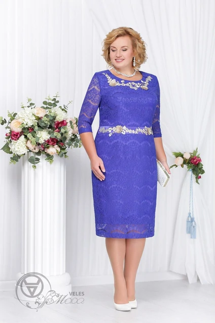 Платье женское, полуприлегающего силуэта, прямое к низу от линии бедра, отрезное по линии талии, с притачной планкой, с подкладкой из хлопчатобумажной ткани по юбке. Длина верхней части по среднему шву спинки 105,0 см., длина по нижней части 95,0 см. Детали лифа и юбки двухслойные, нижняя часть из основной ткани, верхняя из кружева. Нагрудные выточки выходят из проймы. Нижняя часть спинки с талевыми выточками. Нижние детали юбки с выточками. В среднем шве спинки обработана застёжка на потайную тесьму молнию и разрез. Горловина обтачная, углублённая, круглая. Рукава втачные, одношовные, из кружева, длиной 41,0 см. Изделия с плечевыми накладками. На планку и на горловину переда нашиты аппликации.