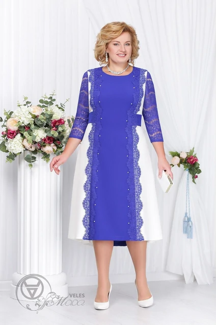 Платье женское, полуприлегающего силуэта, клеш к низу от линии талии, линия низа ассиметрична: спинка длиннее переда, на подкладке из хлопчатобумажной ткани. Длина посередине спинки 118,0 см. Перед платья с рельефами выходящими из проймы до низа не проходящими через центр груди, с нагрудной выточкой из рельефа. Спинка платья со швом по середине, в шве обработана застёжка на потайную тесьму «молния». С рельефами из проймы до низа. Боковые части переда и спинки из ткани отделочного цвета, с притачным поясом выше линии талии. Вдоль по рельефным швам переда и спинки настрочены гипюровые полоски с фестончатым краем, на переде между фестонов пришиты бусины. Рукава втачные, одношовные, длиной 46,0 см. из гипюровой ткани. Горловина углублённая, обтачная, круглая.