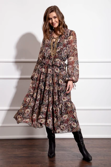 Эффектное платье из шифона с дизайном, разведенное к низу, отрезное по линии талии с регулирующейся кулисой. Лиф платья с разрезом до талии и регулируемой шнуровкой. Нижняя часть платья с притачными воланами со сборкой, нижний широкий волан на запах. Рукава длинные на резинке по низу с декоративными завязками. В комплекте нижнее платье из шифона на тонких бретелях.