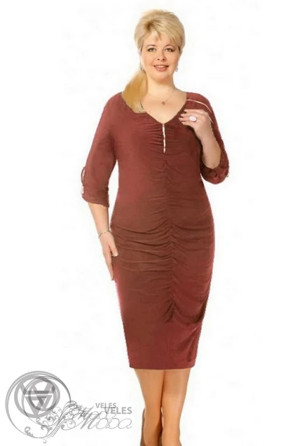 - Платье полуприлегающего силуэта. Перед с нагрудными выточками и центральной линии груди на сборке.Слева отрезная кокетка с металлической молнией. Рукав 3/4 одношовный,втачной. Ткань масло хорошо тянется. Подходит на рост-164-170 см