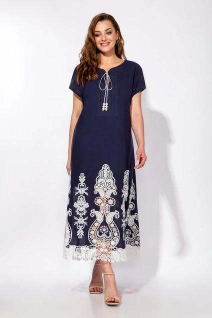 Платье женское из хлопковой ткани на подкладке, с втачной бейкой по горловине, со спущенной линией плеча, в боковых швах обработаны разрезы. Деталь переда платья с нагрудными вытачками, с втачной деталью по центру. Втачная деталь со средним швом и разрезом вверху, разрез с застежкой на декоративный шнур с бусинами-жемчужинами. По плечевым швам обработаны разрезы.