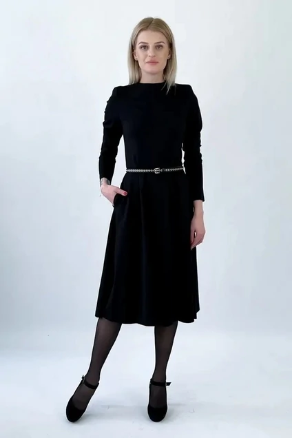 Платье женское миди, отрезное по линии талии. Выполнено из гладкокрашеного трикотажного полотна. Модель представлена в четырёх актуальных цветах: малина, синий, чёрный и горчица. Силуэт полуприлегающий в верхней части и юбка силуэта трапеция. По переду вертикальные вытачки от подреза. Воротник - аккуратная цельнокроеная стойка. Рукав длинный, втачной. Карманы в боковых швах. Спинка со средним швом, с аккуратным V-образным вырезом и скругленными краями. Модель в минималистическом стиле, базовая. Прекрасно подойдет для создания современного образа в любом направлении.