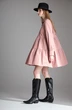 платье выполнено из хлопкосодержащей ткани . Платье свободного силуэта. Воротник рубашечного типа на стойке. Застежка платья по переду на пуговицы. платье оформлено тремя воланами с легкой сборкой. Длина изделия от верхней точки плеча по переду 87 см, по спинке 88 см. Рукав втачной со сборкой, внизу с боковым разрезом и притачной манжетой с застежкой на пуговицы по всему разрезу и манжете. Рукав длиной 64 см.