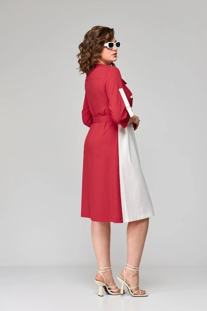 Платье женское А-образного силуэта (расширенное к низу) втачного покроя с центрально-бортовой застежкой на планку, на петли-пуговицы. Платье выполнено из ткани двух контрастных цветов. Рукав одношовный. Спинка со средним швом и кокеткой, горизонтально направленная. Перед ассиметричный. Правая часть состоит из верхней и нижней частей. В верхней части расположен накладной карман с клапаном и отделочной деталью. В боковых швах расположены карманы. К платью прилагается пояс из основной ткани с фурнитурой в цвет золота. Пуговицы металлические также имитируют золото.