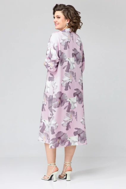 Платье женское, покроя спущенное плечо, свободной силуэтной формы, расширенное к низу. Горловина V-образной формы, по переду расположена встречная складка, на складке пришиты декоративные пуговицы. Рукав 3\4 с манжетой на резинке по низу. Спинка со средним швом. К платью прилагается пояс из основной ткани.