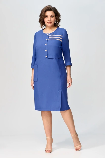По переду платье ассиметричное: в левой части переда расположена отлетная кокетка до уровня талии с деталями в области плеча из отделочной ткани, в правой части в области бедер расположен накладной карман. Дополнением платья служат пуговицы в цвет отделки.