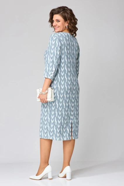 Платье женское полуприлегающего силуэта, втачного покроя рукавов. Платье выполнено из трикотажного полотна плательной группы. Рукав ¾ с имитацией шлицы, фиксирующейся на петли-пуговицы. По переду расположена планка-складка с петлями и пуговицами, нагрудные вытачки, идущие из бокового шва. Горловина округлой формы. Спинка со средним швом, в котором сверху расположена молния, снизу разрез. Платье длиной до середины икры.