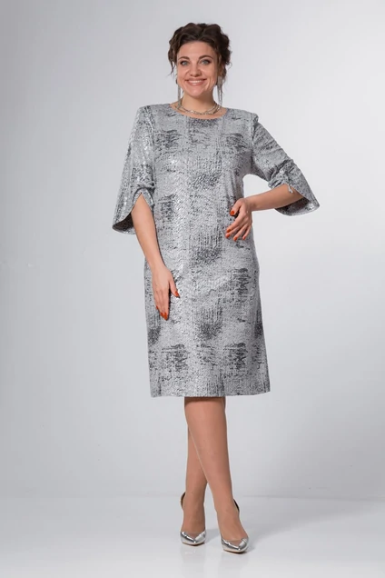 Платье женское, «А» образного силуэта, втачного покроя. Выполнено из трикотажного плательного полотна с блеском. Горловина округлой формы. Спинка со средним швом, в котором расположена тесьма-молния и талиевые вытачки. Рукава ¾, с передним швом, закругленные по низу и задекорированные бантиком из канта основной ткани. По переду расположены нагрудные вытачки, идущие из боковых швов. Спинка со средним швом, в котором расположена капелька, фиксирующаяся пуговичкой и талиевые вытачки.