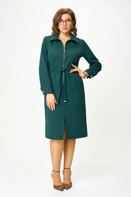 Платье женское, полуприлегающего силуэта, втачного покроя рукава, выполнено из джинсовой ткани. По центру переда вставлена отделочная молния, внизу разрез. Перед отрезной по линии талии, в нижней части с накладными карманами, сверху с нагрудной вытачкой снизу вверх. Спинка так же отрезная по линии талии, нижняя часть со средним швом и талиевыми вытачками, верхняя часть со встречной складкой на уровне талии и кокеткой. На уровне талии настрачивается деталь, через которую на спинке протягивается пояс с пряжкой, по переду пояс завязывается по центру. Рукав длинный, двухшовный, внизу с манжетой, застегивающейся на петлю-пуговицу.