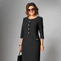 Платье женское полуприлегающего силуэта, втачного покроя с имитацией застежки по переду до подрезной линии, в бочках расположены листочки. Горловина округлой формы, рукава ¾ длины, двухшовные. Спинка со средним швом, в котором расположена тесьма «молния» и шлица, а так же вертикально направленные талиевые вытачки. Платье выполнено из однотонной ткани костюмно-плательной группы.