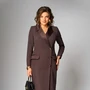 Платье женское, полуприлегающего силуэта, зауженное к низу, с двубортной застежкой (правая часть имеет слегка наклонную линию) на 3 отделочные пуговицы. На спинке средний шов, заканчивающийся шлицей и талиевые вытачки. По переду отрезной бочок, заканчивающийся в области бедер и нагрудная вытачка, в горизонтальном подрезе, в котором выполнен прорезной карман с двумя рамками и клапаном. Горловина оформлена воротником пиджачного типа. Рукав втачной, одношовный, длинный. Воротник, лацкан, клапаны и рамки кармана из атласной ткани.
