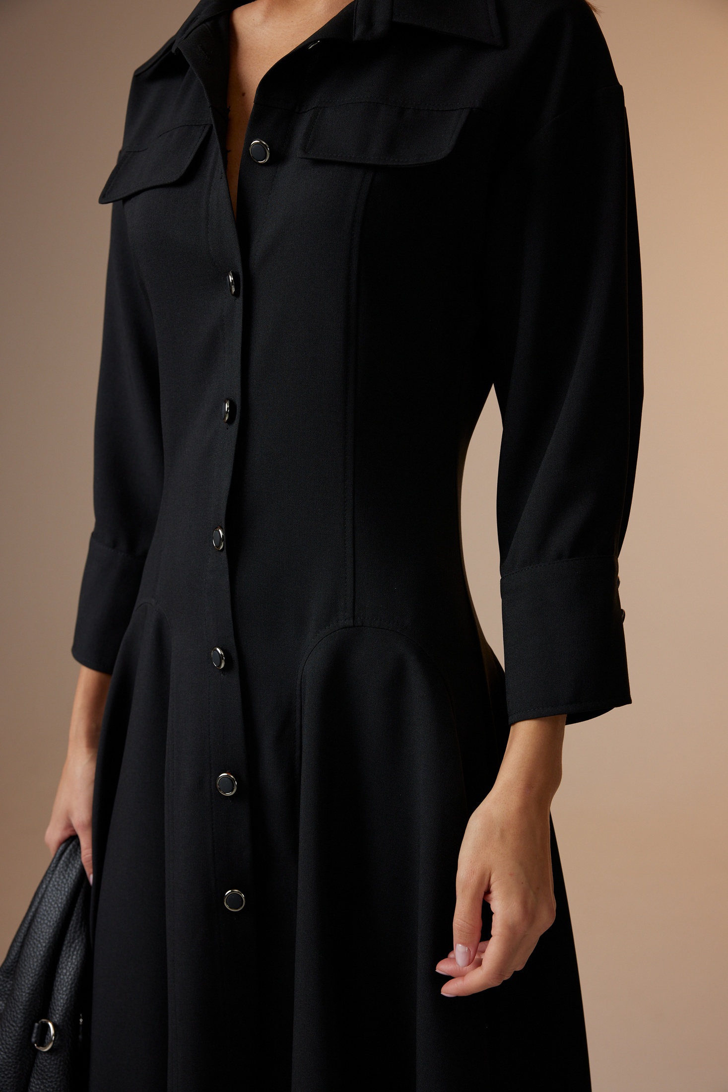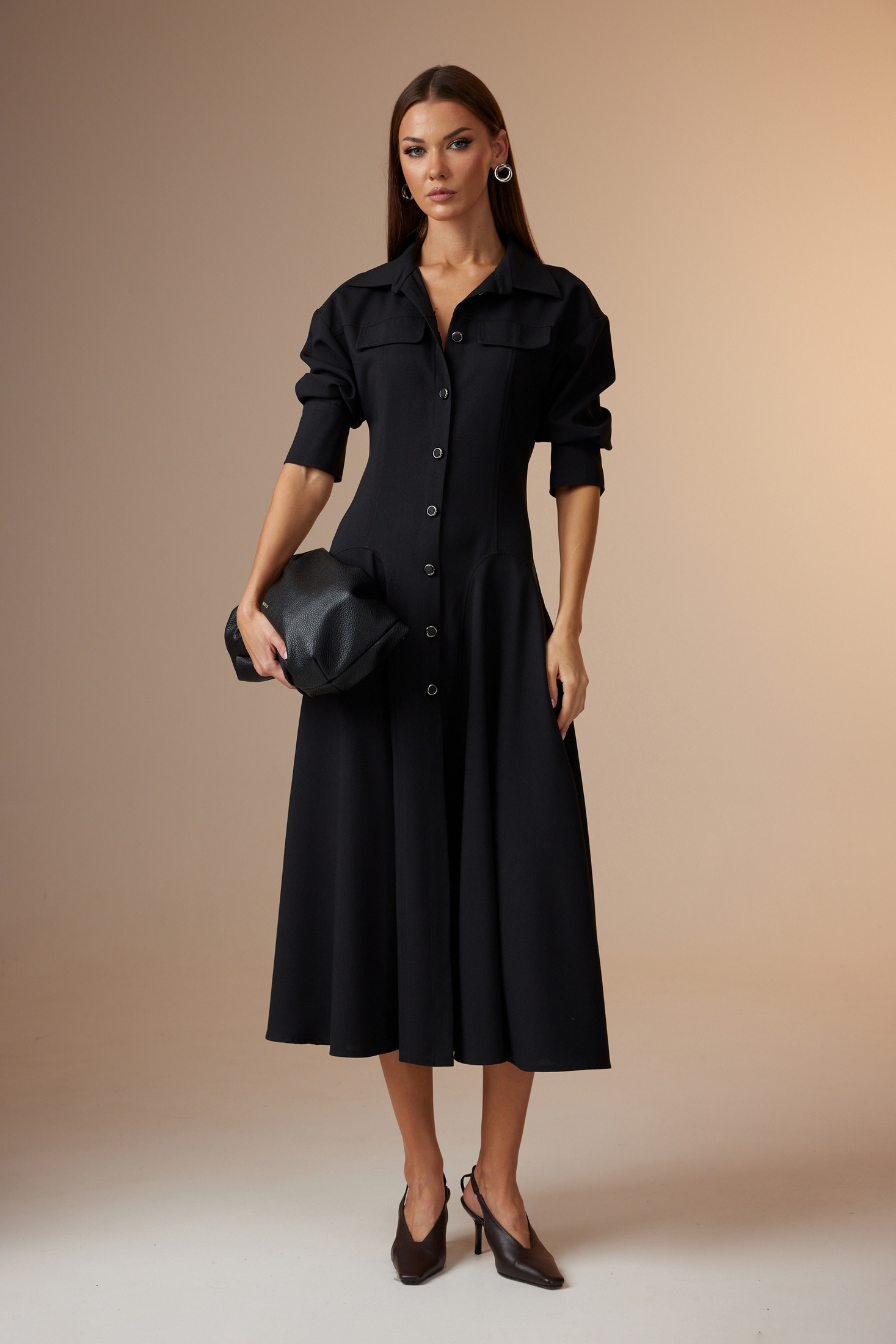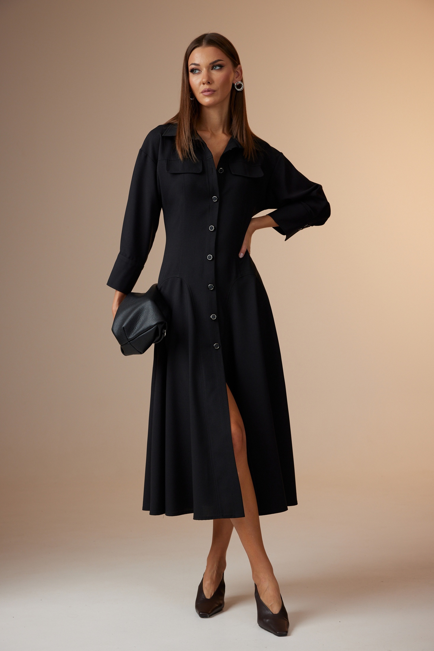 Платье женское полуприлегающего силуэта, длинное, покроя спущенное плечо с центральной бортовой застежкой на петли и пуговицы. Горловина оформлена стояче-отложным воротником с отрезной стойкой. По спинке и переду отрезная кокетка, в которую по переду вставлены клапаны. По спинке средний шов и рельефы. По спинке и переду подрезы круглой формы, в которые вставлены сильно расширенные клинья, которые создают красивые складки по низу изделия. Рукав одношовный, снизу с двумя складками и широкой манжетой, застегивающейся на две пуговицы.