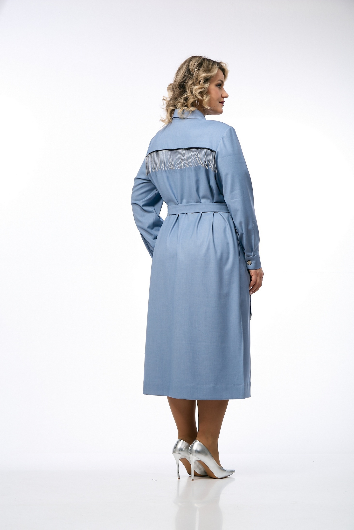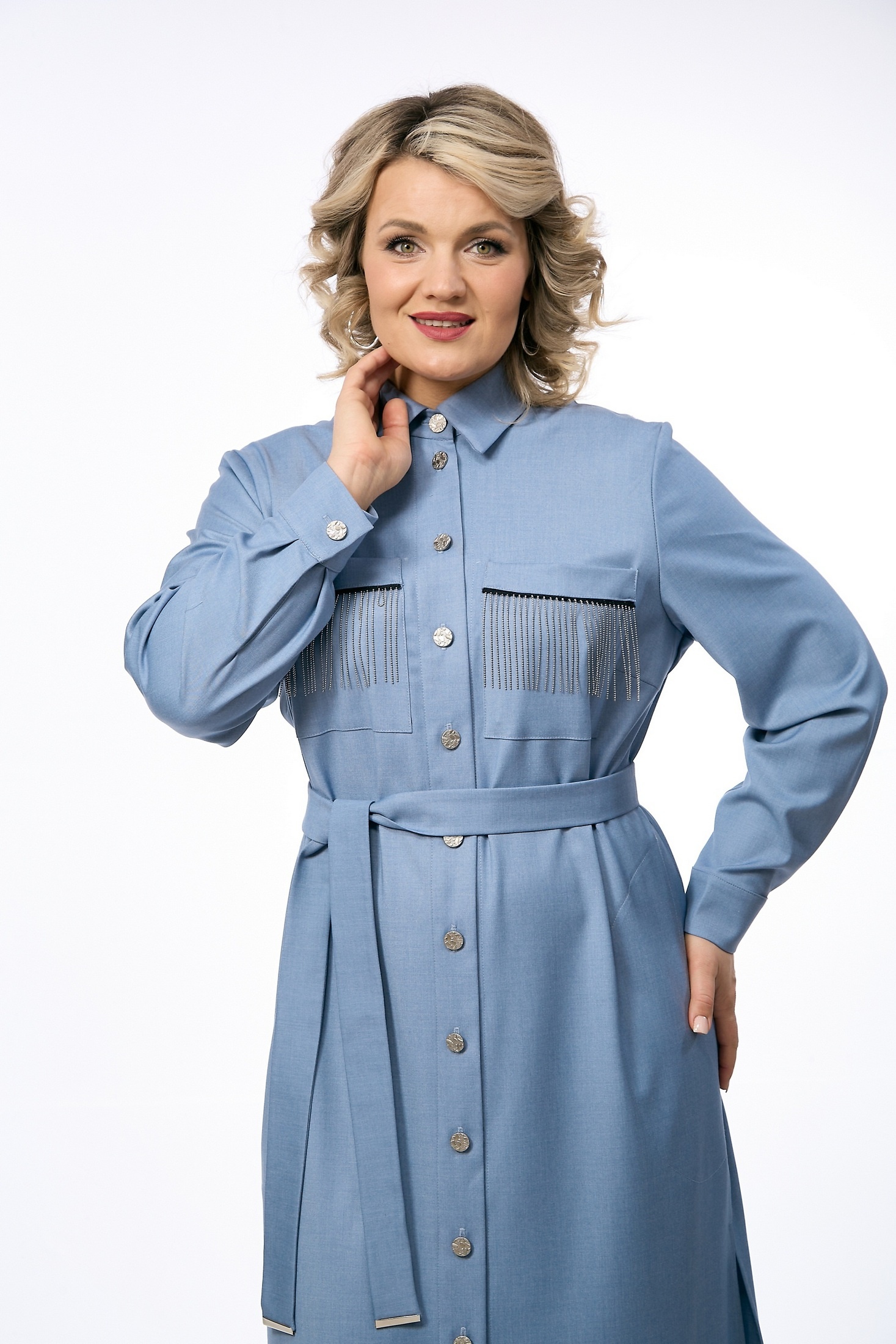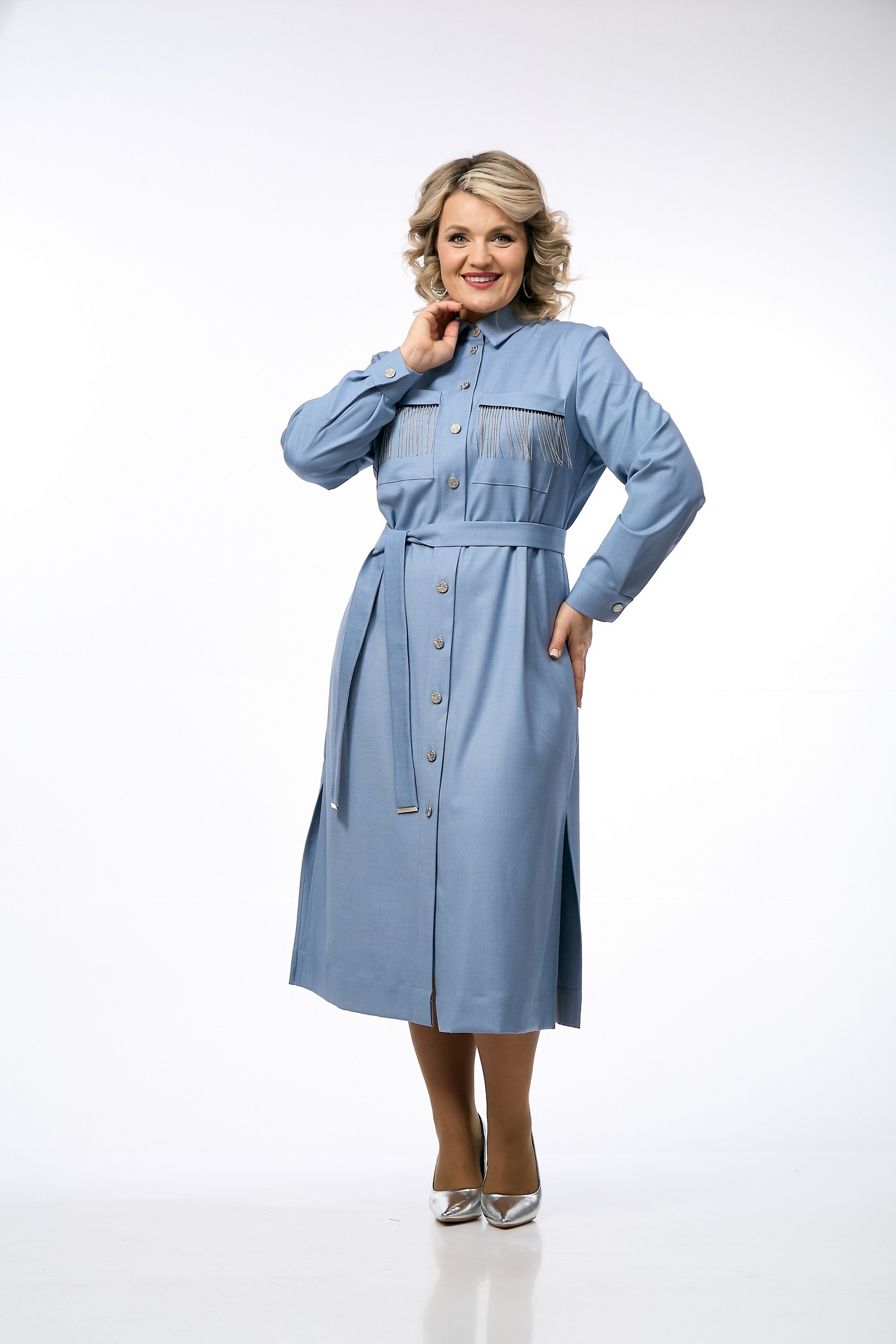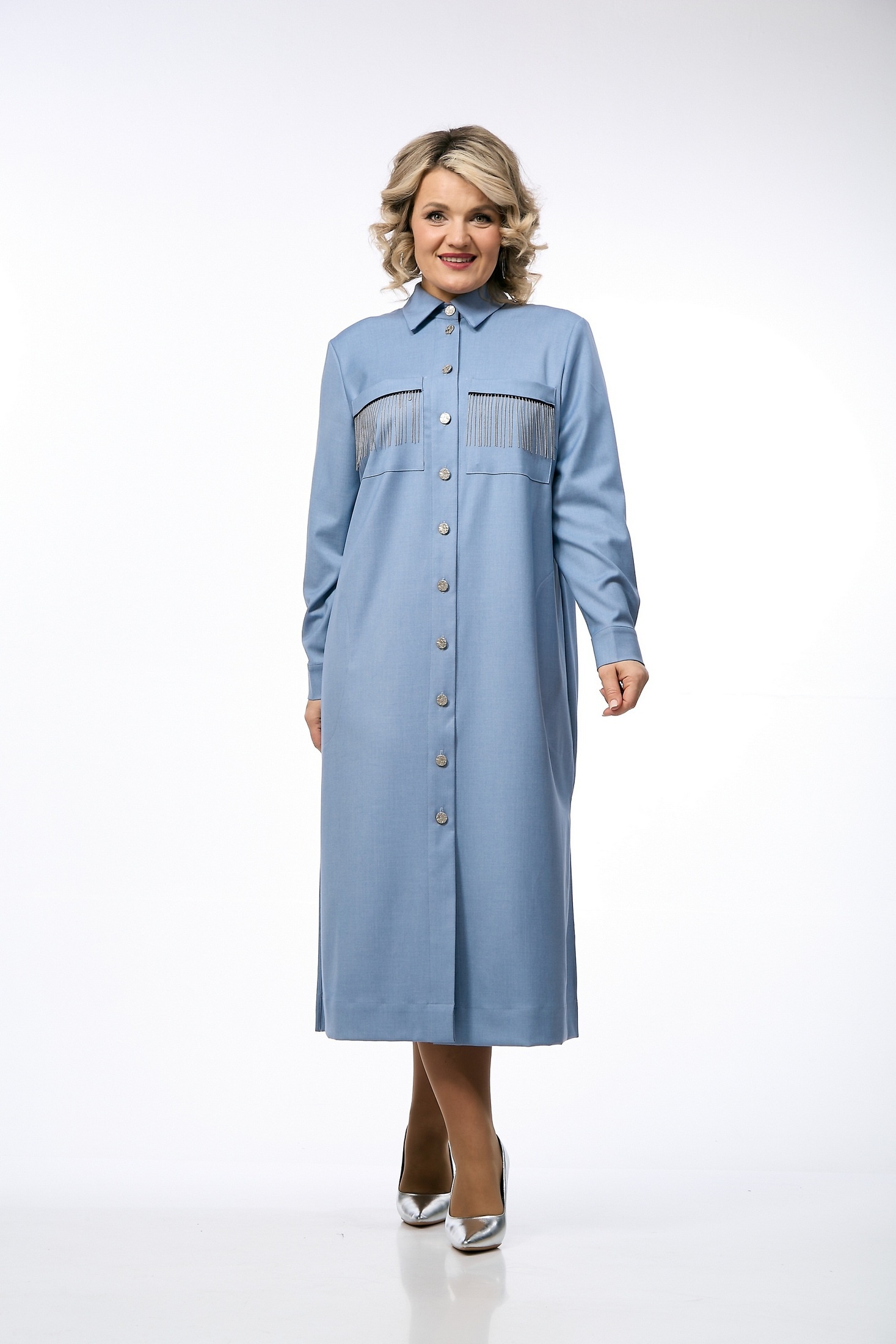 Платье 238 OVERYOU из коллекции бренда OVERYOU представлено в классическом крое платья-рубашки. Изделие выполнено из премиальной поливискозы с добавлением эластана для обеспечения мягкости и комфорта. Материал дышащий и хорошо держит форму, не мнется, что делает платье идеальным выбором для офиса и повседневных выходов. Платье миди длины оснащено рубашечным воротником-стойкой и удобными боковыми карманами, а также декоративными накладными карманами на груди. Дизайнерские акценты, такие как металлические пуговицы, тесьма и металлические элементы на съемном поясе, придают модели уникальность и современный вид. Светло-голубой цвет изделия подходит для любой ситуации, будь то работа, отдых или вечерний выход. Платье может быть носимо как в самостоятельном виде, так и в качестве удлиненной рубашки.