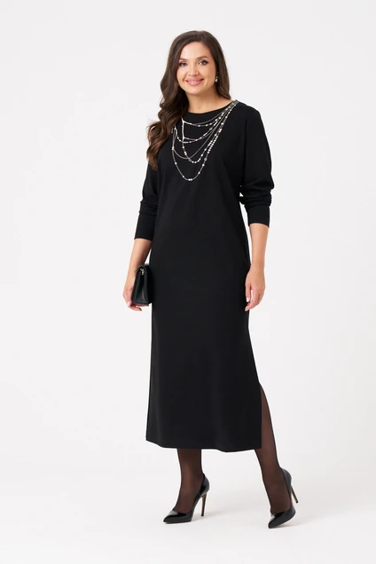 Женское платье из поливискозного трикотажного полотна сочетает комфорт и стиль. Модель выполнена с учетом современных тенденций и идеально подходит для повседневной носки. Перед украшен двумя нагрудными вытачками и дизайнерской вышивкой в виде бус, что придает образу оригинальность. Спинка со средним швом и двумя талиевыми вытачками обеспечивает аккуратную посадку, а потайная застежка-молния в среднем шве облегчает надевание. В боковых швах расположены разрезы, добавляющие легкости и свободы движений. Расширенная горловина создает эффект открытой линии декольте, а длинные втачные рукава делают модель универсальной для прохладной погоды. Это стильное и удобное платье длинной макси и отлично подойдет для повседневных образов и неформальных мероприятий.