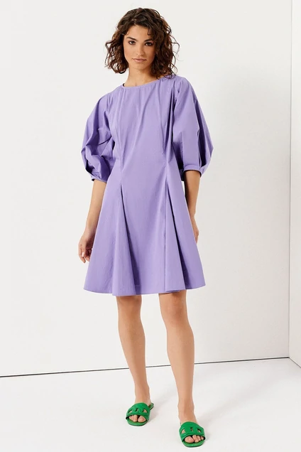 Летнее хлопковое платье станет основой для создания красивых образов. Надевая его на прогулку, дружескую или романтическую встречу, можете быть уверены, что выглядите элегантно. Уместно дополнить наряд обувью на каблуках или низком ходу, аксессуарами. Женское хлопковое платье длиной выше колена имеет полуприталенный фасон. Фигурные вертикальные швы по лифу переходят в симметричные парные складки на свободной юбке. Оригинальность изделию придают пышные втачные рукава на манжетах. Легкая ткань из 100% хлопка, из которой пошито мини платье, максимально пропускает воздух, обеспечивая комфорт в жару. Спешите купить легкое короткое платье на выгодных условиях.