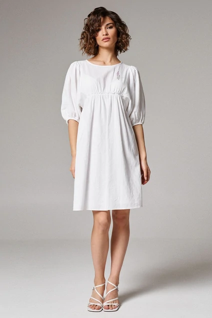Платье женское из хлопковой ткани для повседневной носки. Платье свободного кроя, длиной до коленей. Платье с круглым вырезом горловины, отрезное чуть выше талии. От подреза имеется сборка. По переду платье имеет небольшую декоративную вышивку. Рукава длиной до локтя, низ рукавов оформлен резинкой с декоративной сборкой по низу. Платье имеет хлопковую подкладку. которая вставлена в подрез чуть выше талии. 42 Платье: Длина изделия - 95см, Длина рукава - 39см, Ширина плеча - 6,4см, Ширина по груди - 47см, Ширина рукава - 35,8см