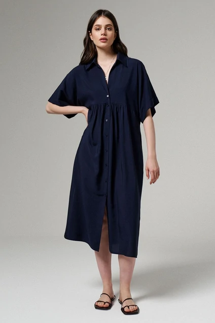 Платье женское из вискозной ткани для повседневной носки. Изделие с коротким цельнокроеным рукавом, воротником- стойкой, фронтальной застежкой на пуговицы. Рукав оформлен притачной отложной манжетой. По переду подрез по линии груди. В боковых швах разрезы от низа изделия. Длина платья до середины голени.