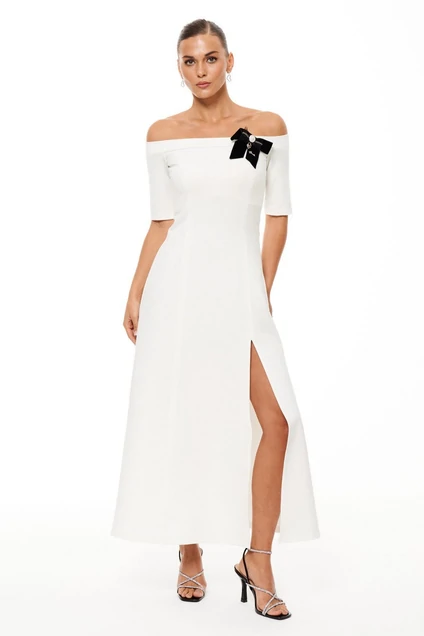 : Вечернее платье из вискозного трикотажного полотна с прилегающим лифом и расклешённой юбкой с высоким разрезом спереди. Верх изделия с открытыми плечами. Благодаря плотному прилеганию платье хорошо держится на фигуре. Через центры груди по переду проходят два рельефа с отстрочкой. По спинке также два рельефа. Длина рукава до локтя. В боковом шве потайная молния. Комплектуется съёмной декоративной брошью