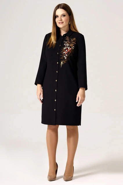 Эффектное, стильное платье. Декарировано дизайнерской вышивкой по переду, помогает создать законченный, многогранный, но лаконичный образ. Хороший вариант, как для будней, так и для выхода в свет. Платье прямого силуэта, воротник отложной, с центральной застежкой на пуговицы, в боковых швах обработаны боковые карманы, низ платья в боковых швах, оформено разрезами. Рукава втачные, длина 7/8, заканчиваются шлицами на петли пуговицы.